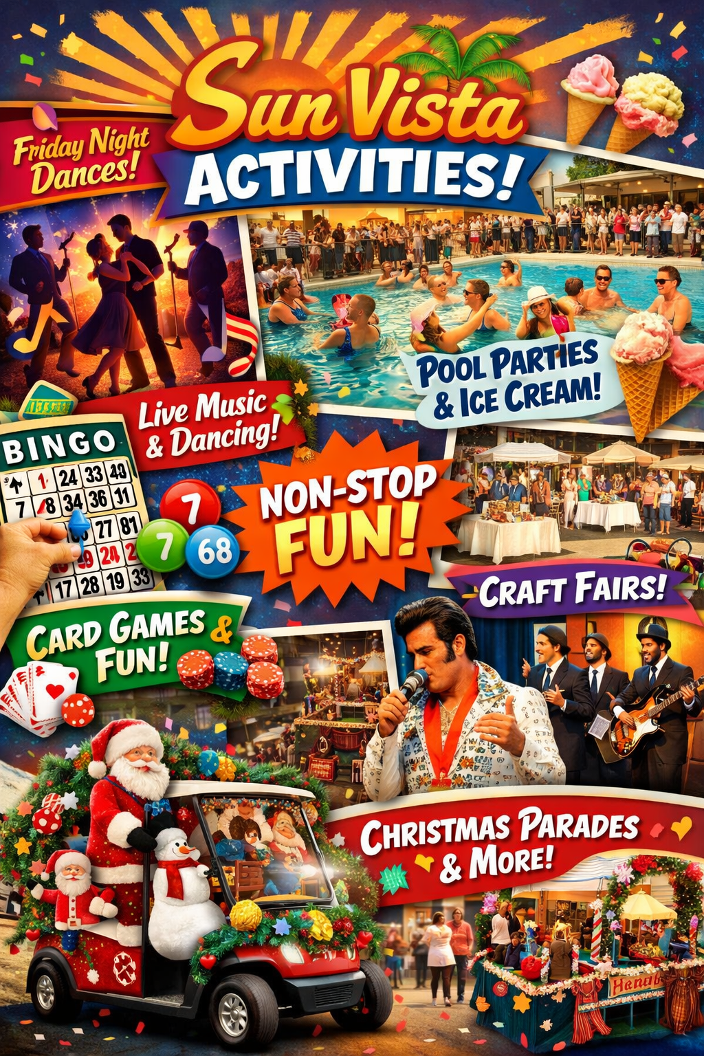 There’s always something happening at Sun Vista RV Resort! 🎉 From Friday night dances with live music to pool parties with ice cream, bingo, card games, tribute concerts, craft fairs, holiday parades, and tons of other activities — the fun never stops around here.